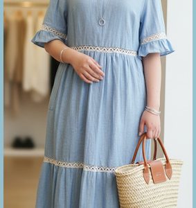 Natūralaus lino bohemiško stiliaus suknelė, kurioje dominuoja pastelinės spalvos ir nėriniai. Suknelė padalinta į dvi dalis. Viršutinė dalis yra pilkšvos spalvos su smulkiu tekstūriniu raštu. Apatinė dalis – sniego baltumo, suteikianti įvaizdžiui lengvumo.  Suknelės apačia užbaigta plačiu raukiniu, kuris suteikia „A“ formos siluetui apimties. Šonuose su kišenėmis. Rankovių kraštai ir suknelės apačia papuošti subtiliais nėriniais, priduoda vintažinio prieskonio. Baltas lino diržas, surištas kaspinu, pabrėžia liemenį ir sujungia viršutinę bei apatinę drabužio dalis. Norint laisvumo galima dėvėti ir be diržo. Suknelė puikiai tiks pasivaikščiojimui mieste, susitikimui kavinėje ar laisvalaikiui gamtoje.