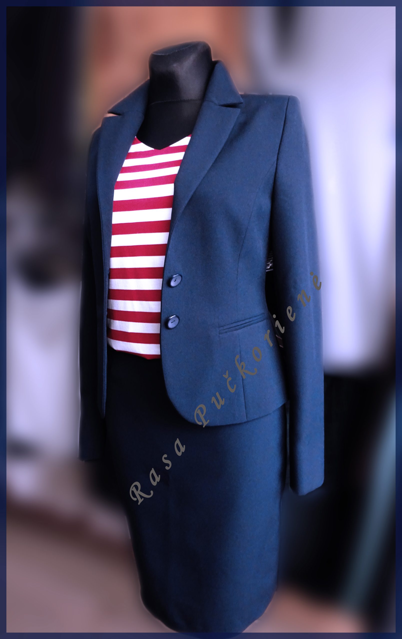 Klasikinis kostiumas ,,Blue” yra su pamušalu, kurį sudaro švarkas ir sijonas. Sijonas tulpė formos, nugaroje uždengtas skeltukas, švarkas paliemenuotas, su kišenėmis. Tamsiai mėlynos spalvos.