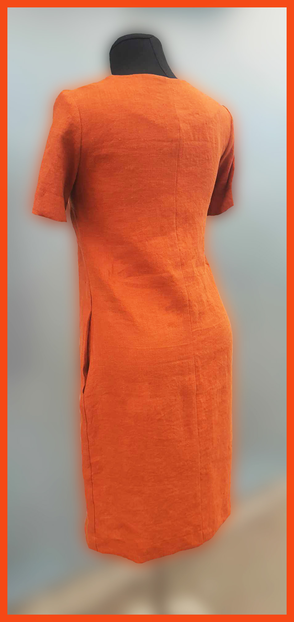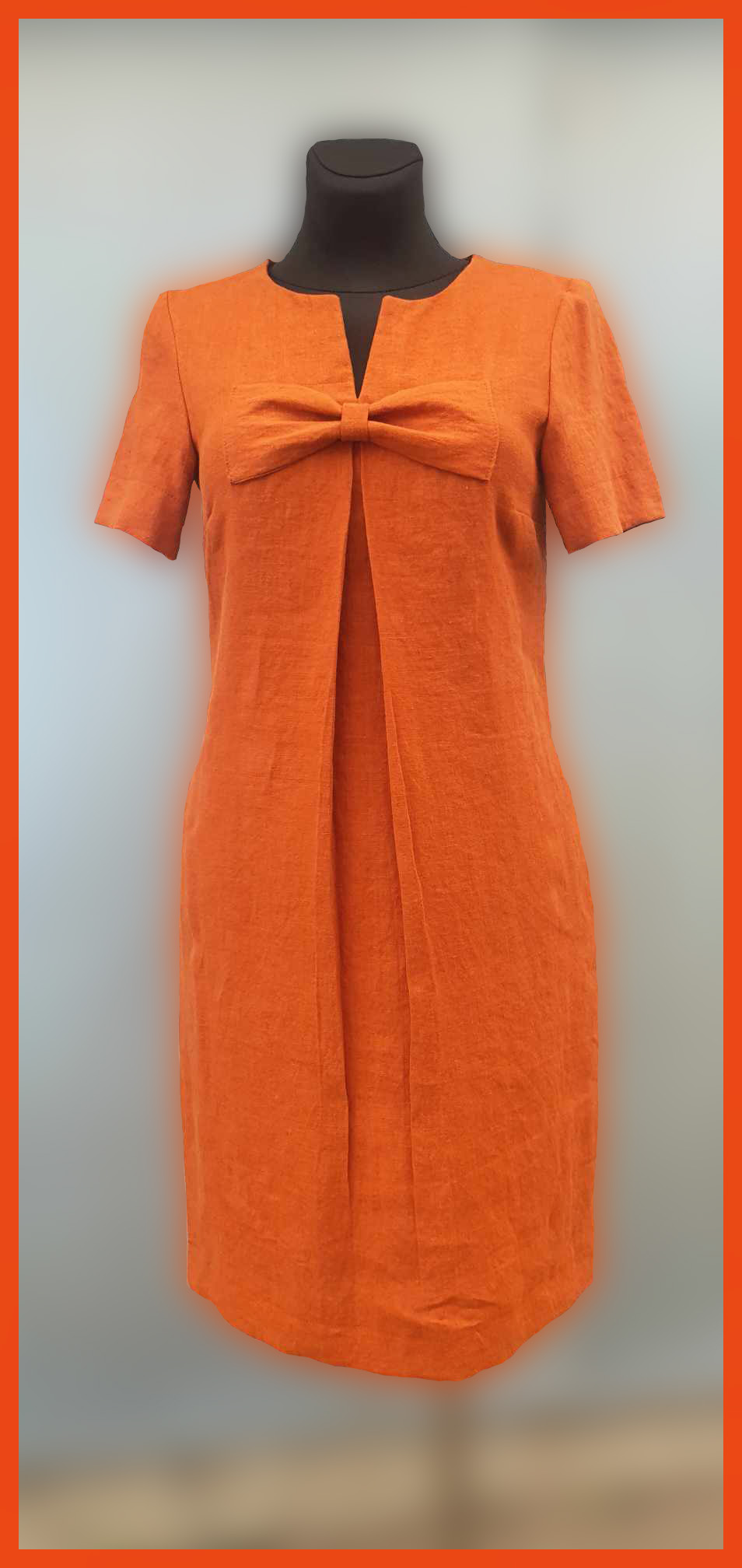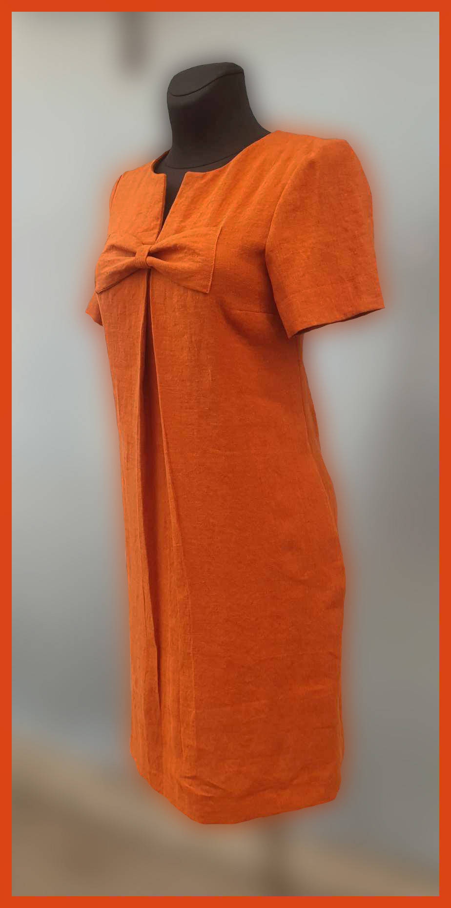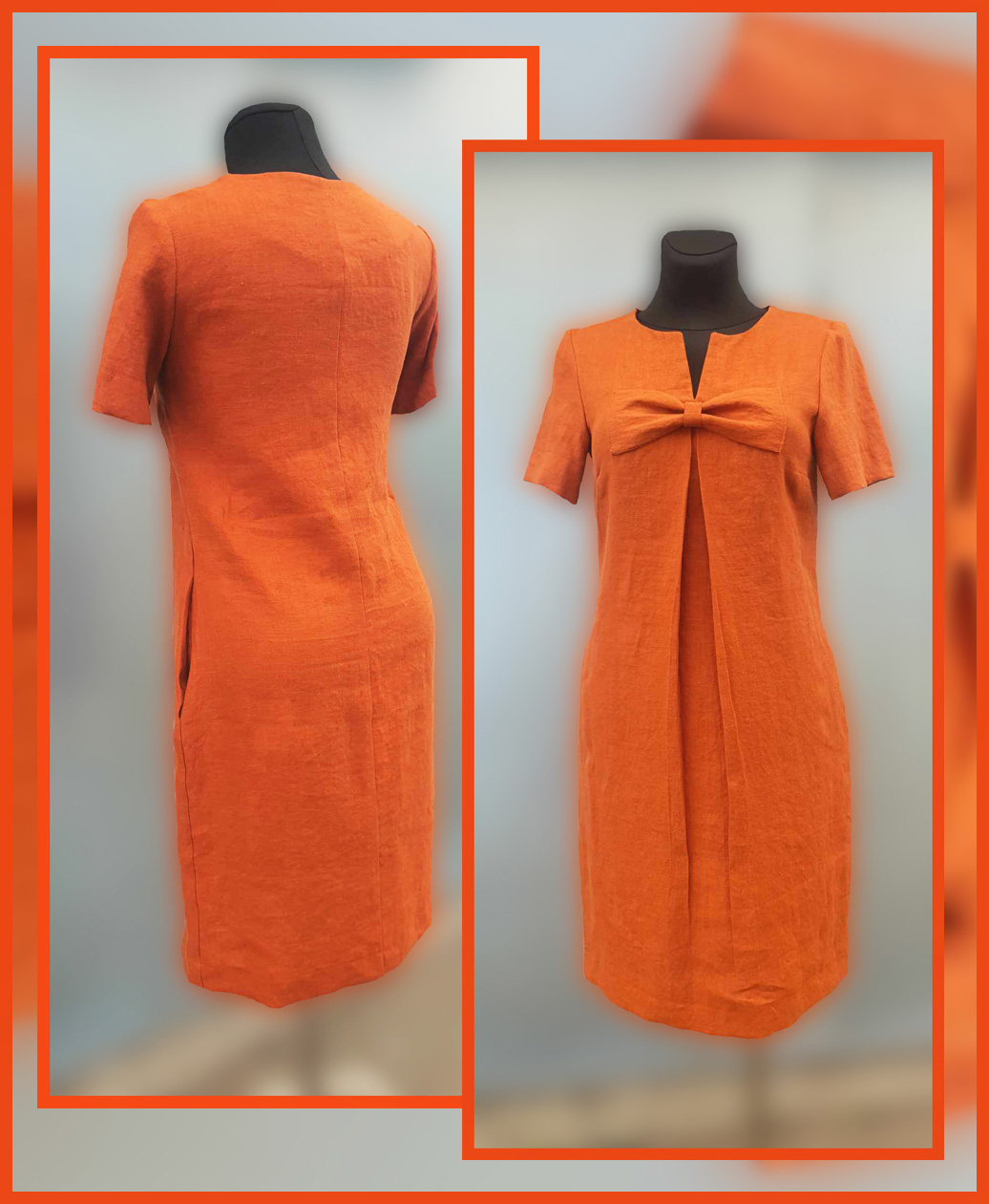 Klasikinė lino suknelė pasiūta iš 100% natūralaus minkštinto lino, puošta kaspinėliu. Šonuose kišenės. Suknelės dydis M, tinka 86cm krūtinės apimčiai, klubai 95cm, suknelės ilgis 100cm. Galimi ir kiti dydžiai.