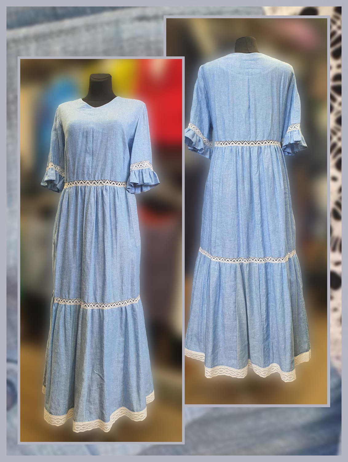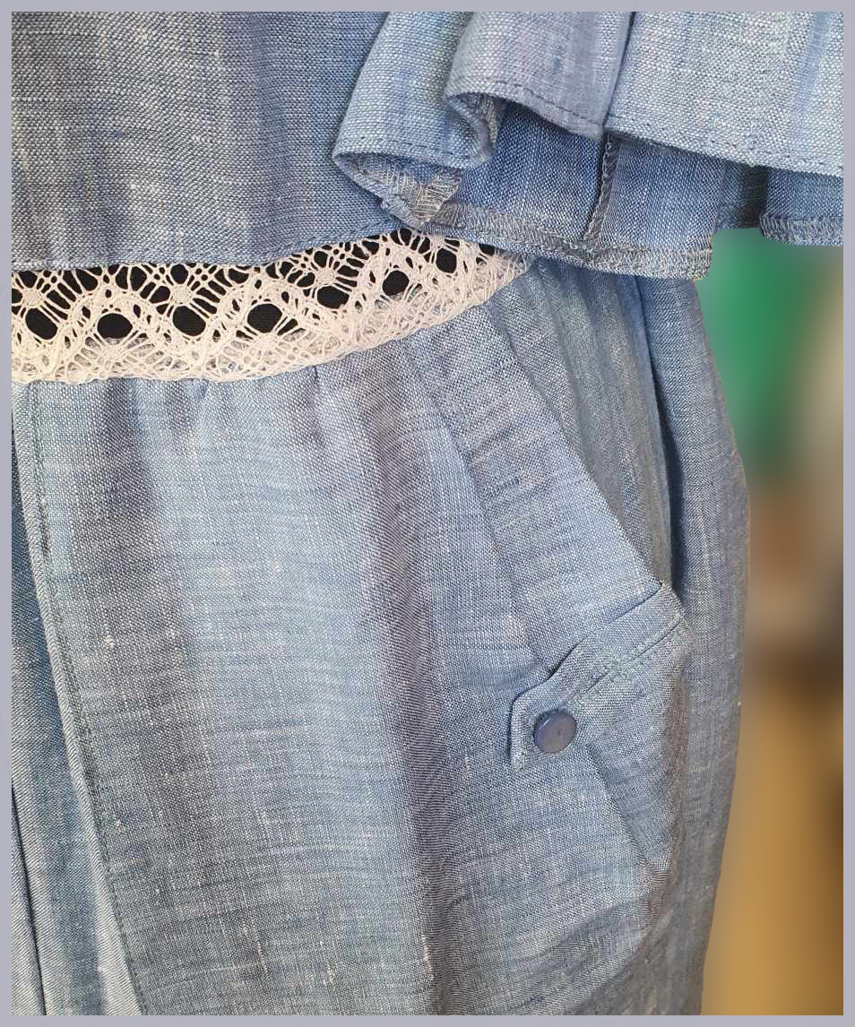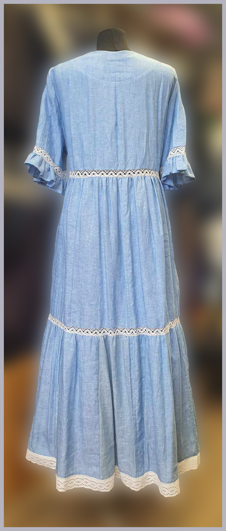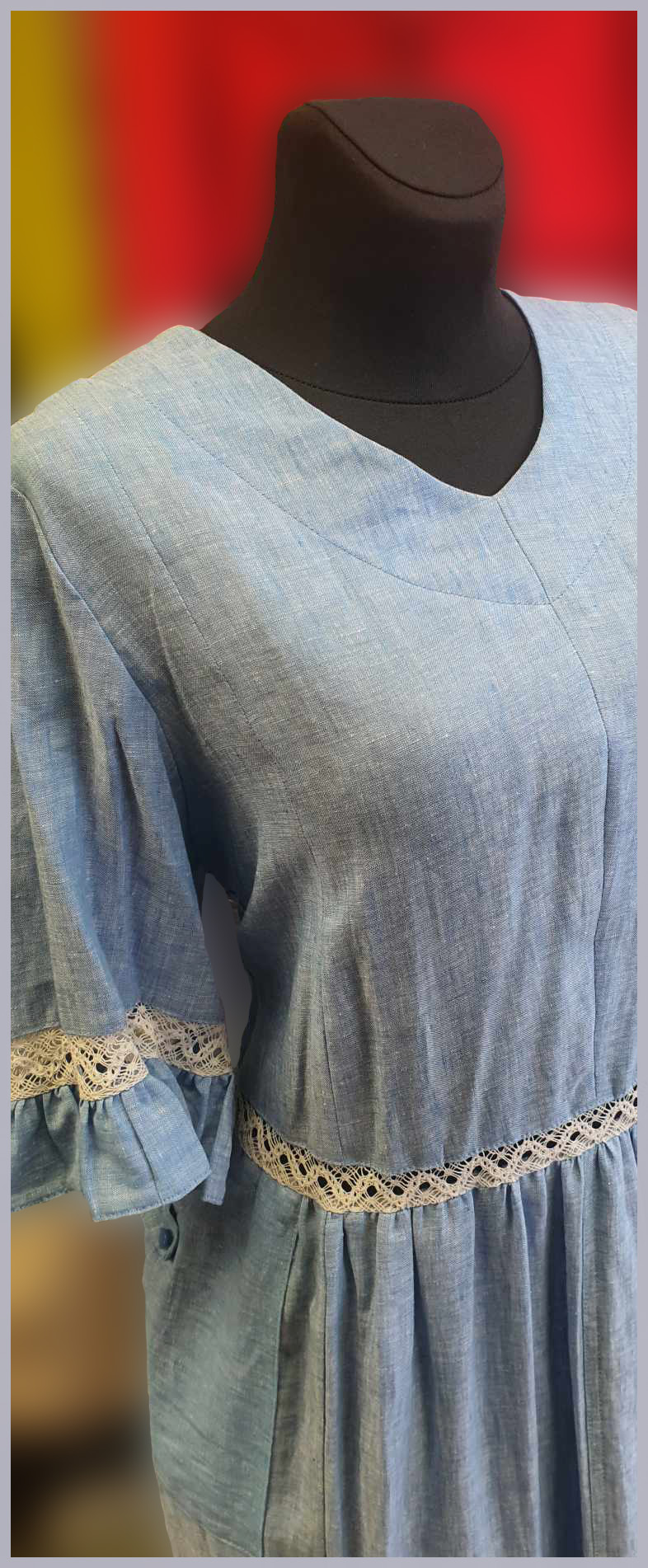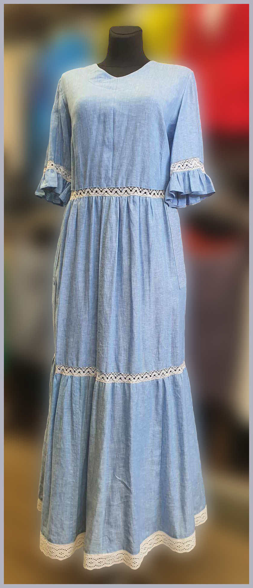 Suknelė pasiūta iš 100% minkštinto lino. Puošta nėriniais ir raukinukais, šonuose uždėtinės kišenės. Suknelės ilgis 150 cm, krūtinės apimtis  120 cm. Su šia suknele moteris gali sau leisti jaustis ne tik patogiai, bet ir išskirtinai.